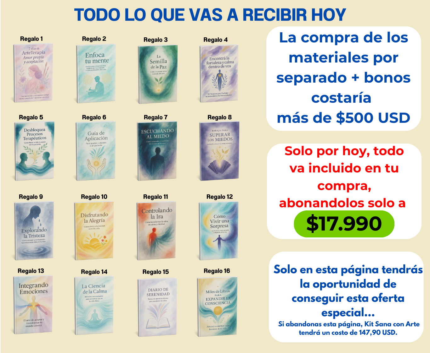 Estás comprando un ebook digital de Arte Terapia, una guía práctica con más de 30 ejercicios y herramientas para reducir el estrés, liberar emociones y recuperar tu calma interior. Además, te llevás bonus de regalo exclusivos que potencian tu transformación.